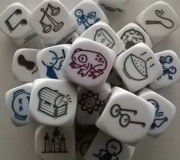 All diese Karten und Würfel laden dazu ein, sich ein Bildmotiv oder mehrere nacheinander anzuschauen und dazu eine Geschichte zu erzählen.