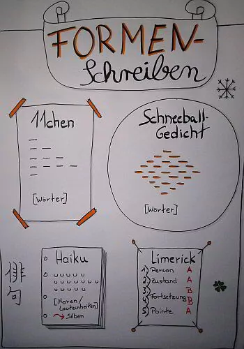 - Feste lyrische Formen bieten dir einen Rahmen, bei dem du über die Gestaltung deines Textes nicht mehr nachdenken musst. Du kannst dich auf den Inhalt konzentrieren. Schlagworte dafür sind: Limerick, Schneeballgedicht und Haiku. Oder meine Lieblingsform, die Elfchen. Elf Wörter, die sich auf fünf Zeilen verteilen (1, 2, 3, 4, 1). Die kann man auch wunderbar mit mehreren entstehen lassen, indem man den Zettel, auf dem jeder die erste Zeile notiert hat, an die nächste Person weitergibt. Oder wie wäre es damit, mal – nach einem festen Schema – zu reimen?